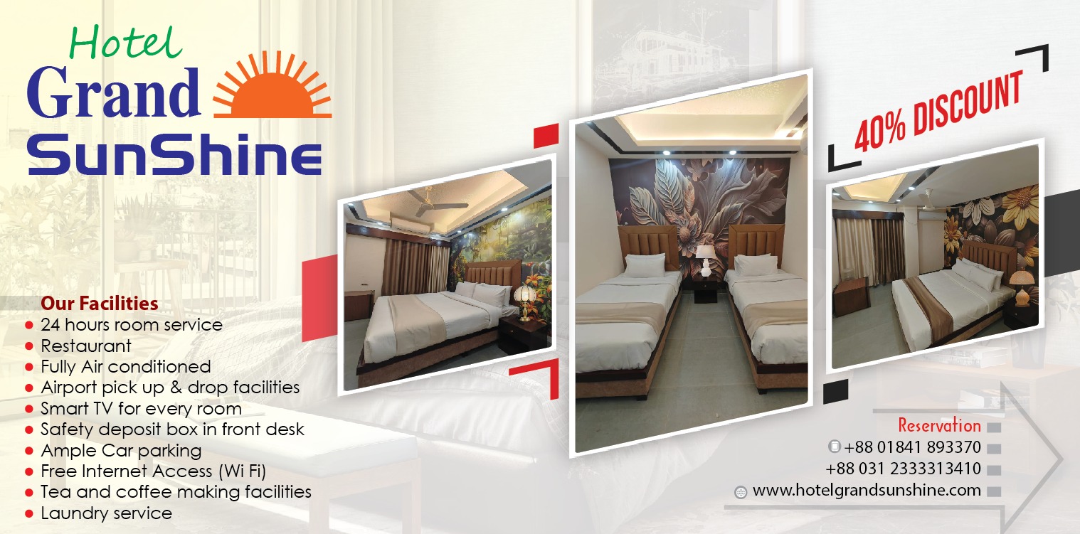 Welcome to Hotel Grand Sun Shine One of the first standard luxury hotels in Chattogram, Bangladesh. It is located in Agrabad, the business hub of Chattogram City, a 30-minutes’ drive from the Shah Amanat International Airport. Hotel Grand Sun Shine is one of the best luxury hotels in Chattogram, Bangladesh. It’s an oasis that reflects contemporary styles of living. We are committed to providing the guest with world-class hospitality at an affordable price. Hotel Grand Sun Shine Chattogram features 10 rooms with a flat-screen TV with satellite channels, as well as a mini fridge bar and tea and coffee making facilities. A full country and continental breakfast is served every morning in the restaurant at Hotel Grand Sun Shine. We have been committed to providing the guests with the utmost hospitality & luxury at an affordable price, ensuring comfort and service.
